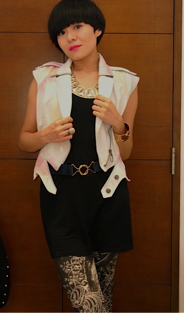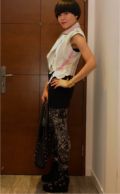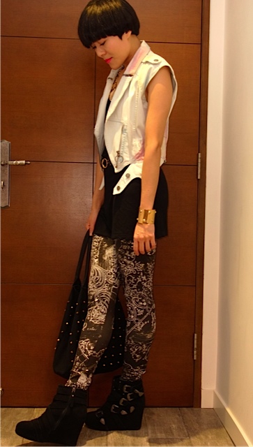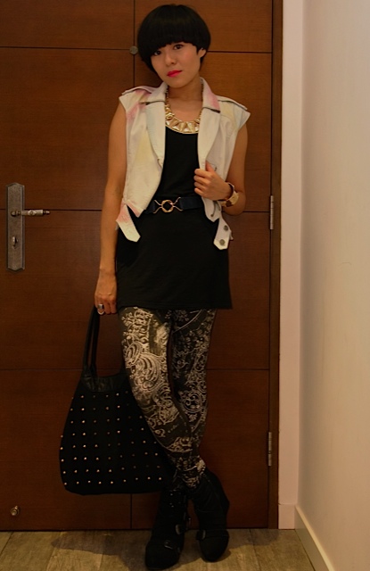 Milkandhoney denim vest; Taobao black long top; Daddy Longlegs pattern leggings (I.T); http://www.asos.com gold necklace; H&M gold cuff; Yves Saint Laurent navy belt with buckle; House of Holland ring; 3.1 Philip Lim studds bag; Pedder Red black ankle boots with buckles.