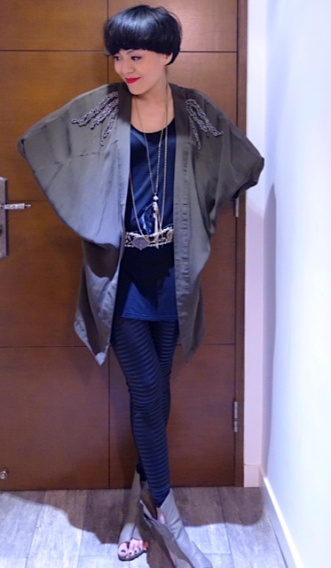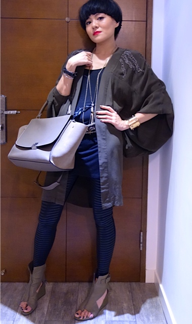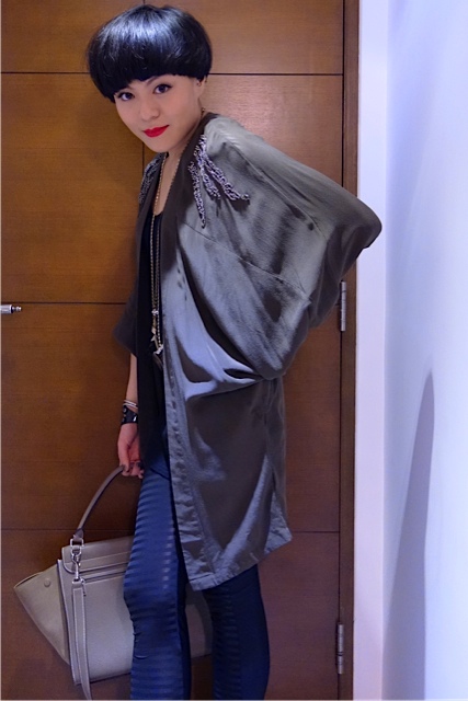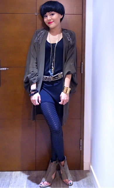 OneTeaSpoon Military green  jacket with bling bling details、淘寶Black long top、www.asos.com silver necklace with feather pendant、H&M Bangle、Burberry Black leather bracelet, David Yurman bangles、Vintage belt from嚤囉街、AAA Black leggings、Celine Trapeze handbag & Alexander Wang wedges。