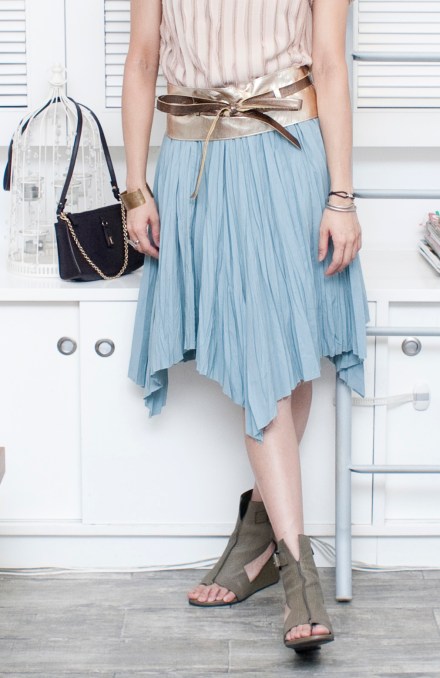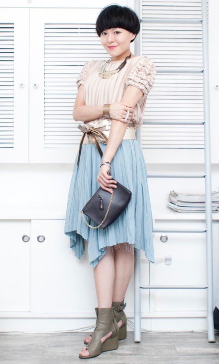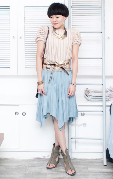 我自問不是那種日本可愛女生的材料,不過有時候都想穿得女仔一點嘛,所以我選擇以泡泡袖的粉色top襯不規則剪裁的半截裙,來營造這個girly yet stylish的造型,不得不提粗身metallic belt是整個造型的亮點,繫上大蝴蝶結的腰帶有助凸顯修腰效果,而且可以將其演繹成one piece dress一樣,令裙款作更多元化的配搭。