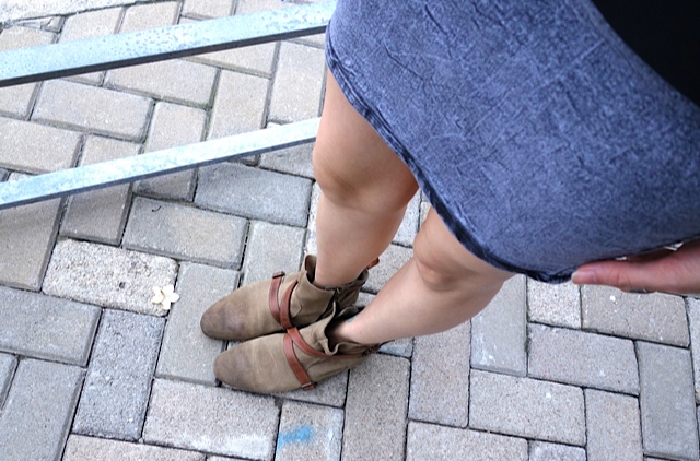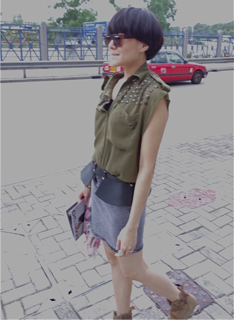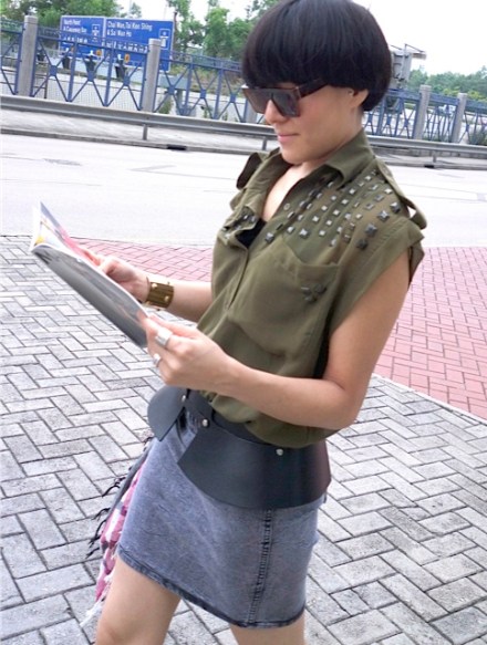 No Brand military green studds shirt; H&M denim skirt & chunky bangle; Zana Bayne leather peplum belt from IFC Lane Crawford; ASOS ankle boots.