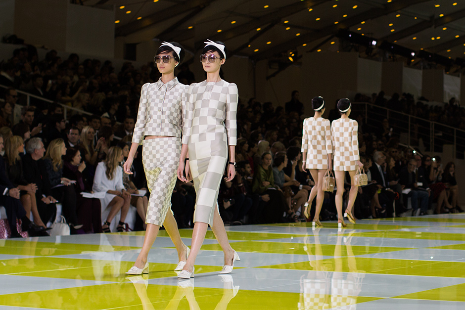 Louis Vuitton大玩懷舊風潮,開場時大批模特兒穿著60’s mod checks從電梯走到舞台,連舞台也採用黃拼白色格仔地面為註腳,場面震撼而且非常eye-catching。