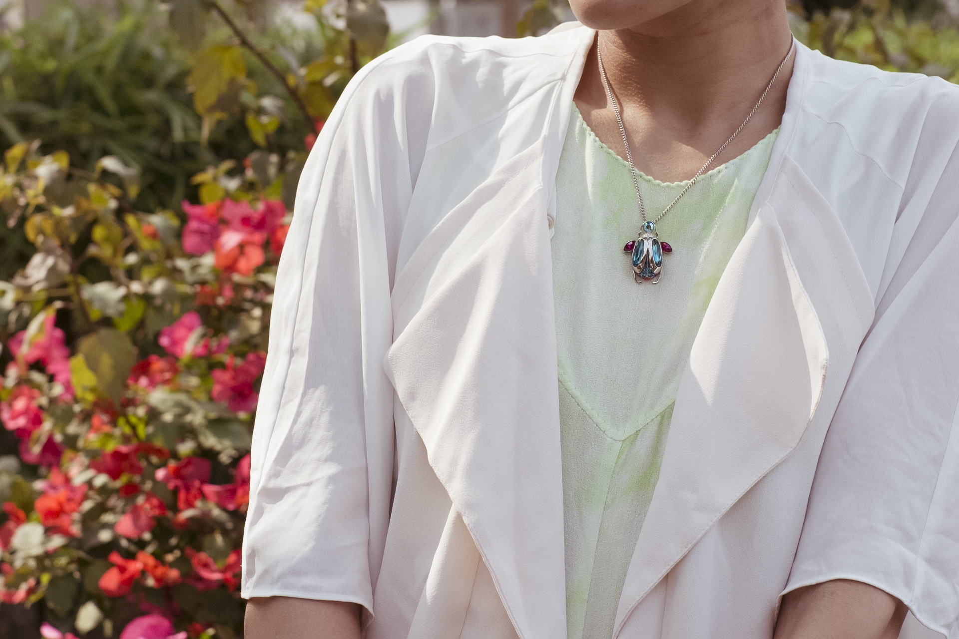 Helen, thanks for sharing the styling tips with us.相信甲蟲項鏈在粉紅色薄紗恤衫的襯托下顯得更生動可愛。