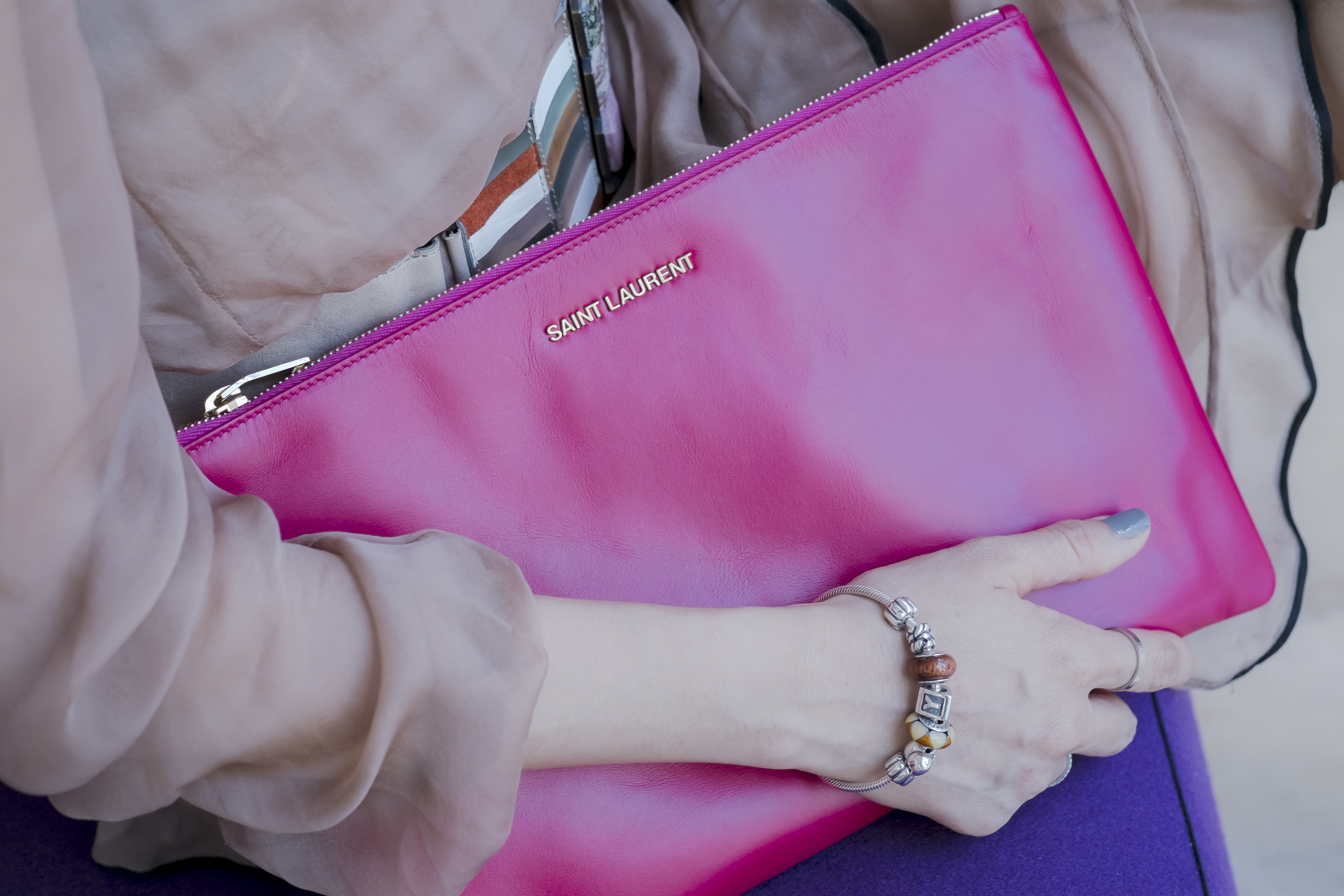 On Me: Valentino beige chiffon dress; YSL pokka dots sunglasses; Fendi multi-colorbelt; Pandora Bracelet; H&M rings; Piaget vintage watch; Saint Laurent fuschia envelope clutch; MaxMara MM01 orange sneakers.