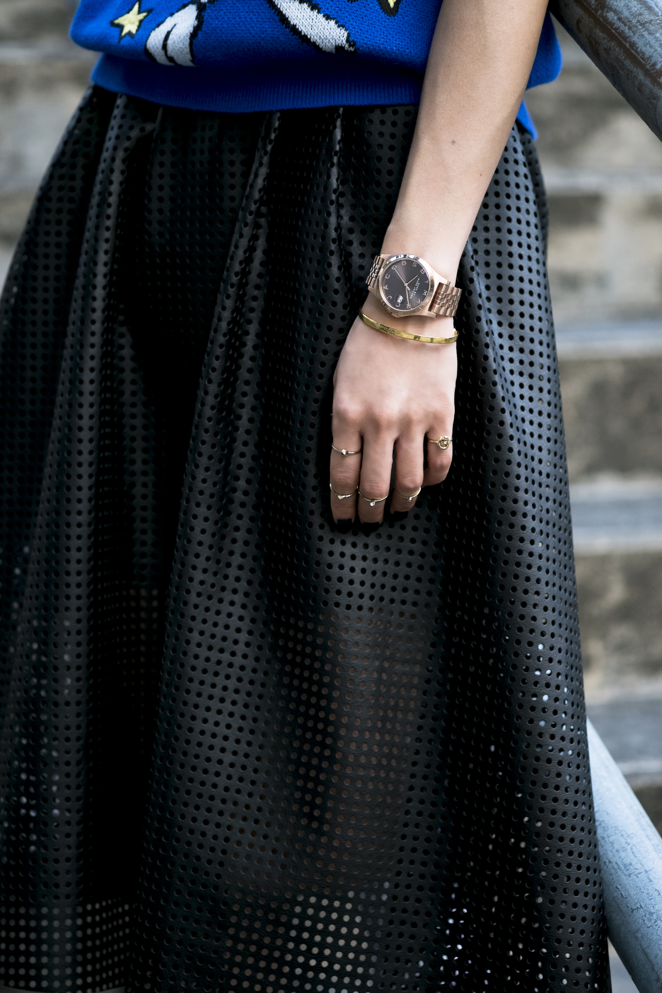 土豪金雖然未必人人受落,但近兩季我卻獨愛金飾,並喜歡將手鏈、手鐲及手錶互相配襯出不同造型。Marc by Marc Jacobs玫瑰金色手錶是我的新季獵物,個人向來特別喜歡boy-size手錶,但由於手腕較纖幼,所以每次佩戴大size的手錶時都看似有點怪怪的,剛好MMJ Slim 36mm手錶的錶面大小恰到好處,尤其喜歡玫瑰金色鋼帶跟深灰色錶面的併合,帶點復古味道卻不失型格感覺。