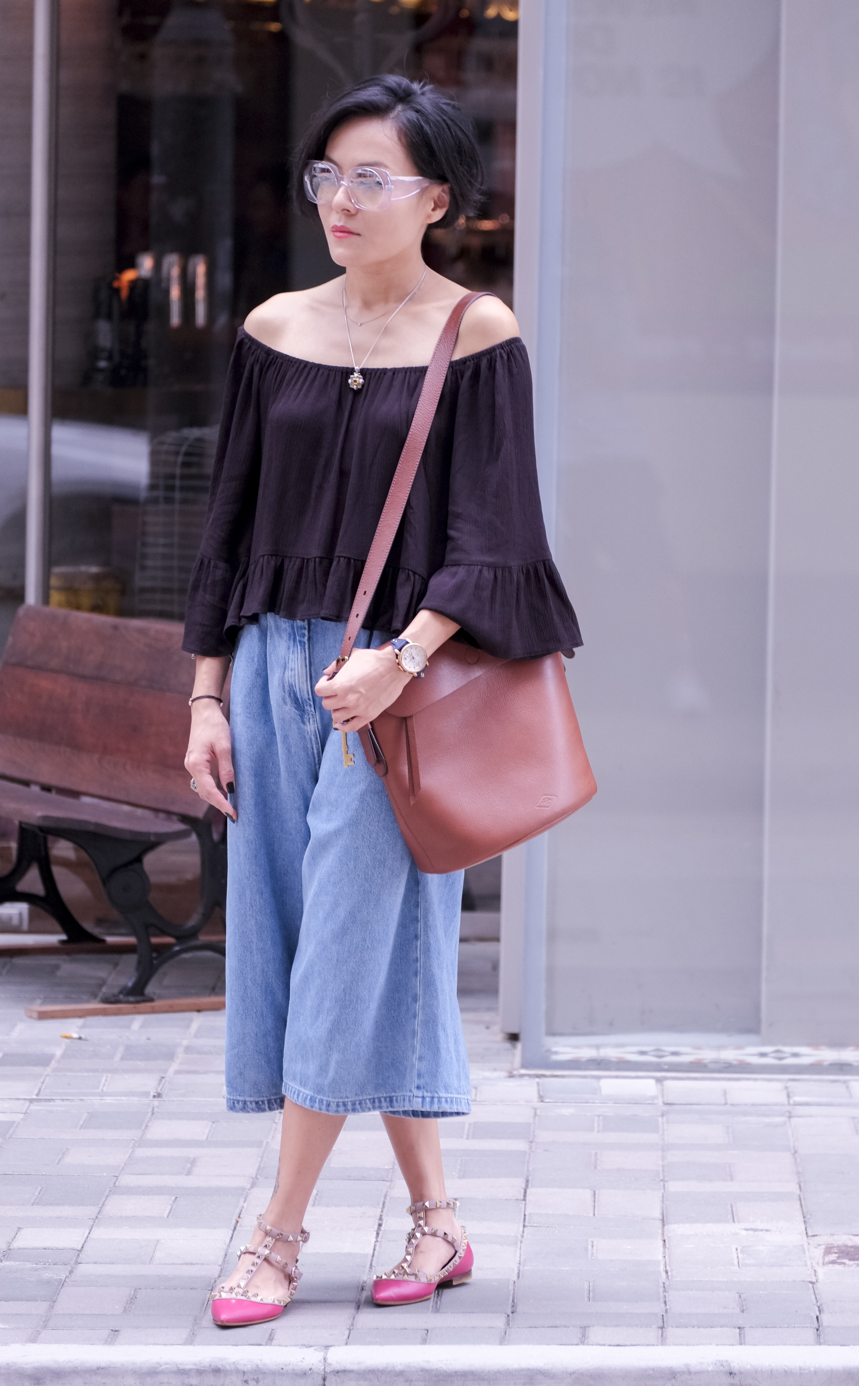 TOPSHOP black top; EDIT denim flare pants; CHANEL sunglasses; FOSSIL Original Boyfriend watch & Haven Bucket leather bag; VALENTINE rock studs flats.